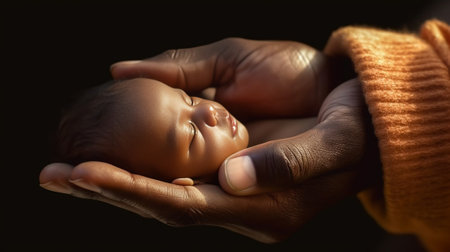 Little baby in fathers hand Side view of black hands holding cute little baby while isolated on white background : Generative AI