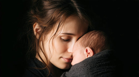 Mother lovingly cradles her newborn in a close embrace, highlighting their emotional connection and serene moment in a dramatic black setting.
