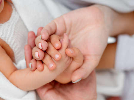 Close-up detail macro view of parent holding baby little hand in his big hand. Soft child skin. Love and family emotion