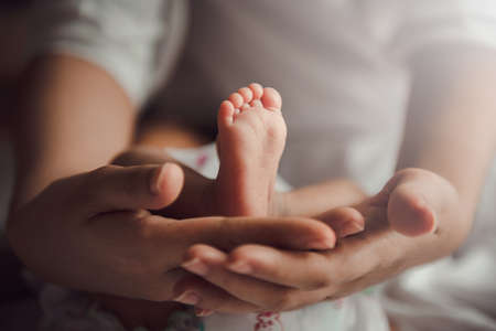 Close up of newborn baby feet. Baby's feet in the mother hands. Baby. Cozy. Family.