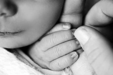 A newborn holds on to moms, dads finger. Hands of parents and baby close up. A child trusts and holds her tight. Black and white photo.