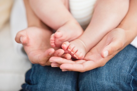 Close-up of young mother holding the little feet of her baby while she lying on her knees