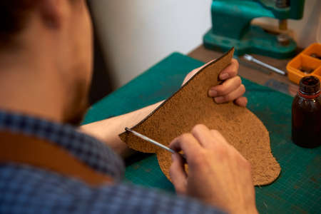 The tanner makes hole in workpiece. Male hand performs work on table with tools in soft focus. Small business concept