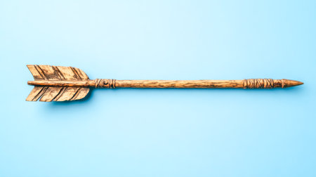 Hand carved wooden arrow on light blue background symbolizing direction and target