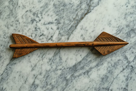 A handcrafted wooden arrow rests on a smooth marble surface. The piece showcases intricate carvings and a natural wood finish, highlighting the artists craftsmanship and design.