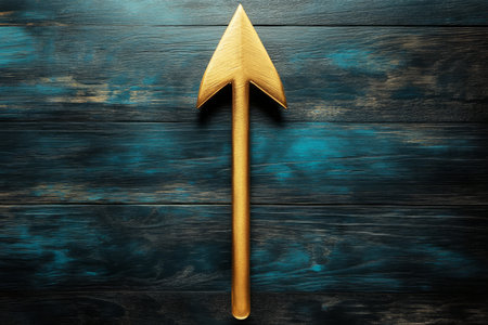 Golden Arrow Soars High Above Rustic Wooden Board, Signifying Success, Growth, and New Opportunities