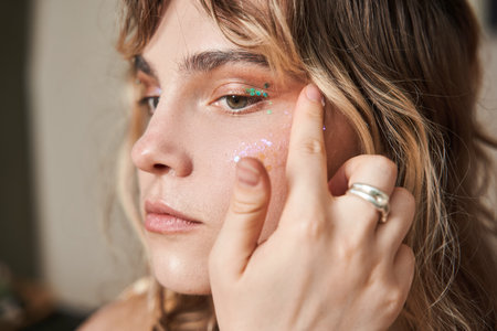 Teen girl with bright make up and rhinestone in heart shape examining herself