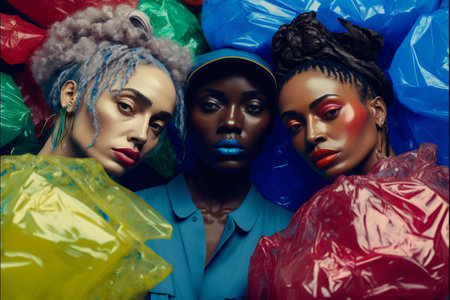 Group of three african american women with plastic bags. Beauty, fashion. Plastic waste fashion, recycling, upcycling, models dressed in upcycled fashion.