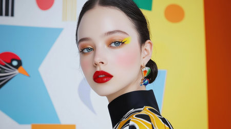 A stunning portrait featuring a model showcasing vibrant makeup with bold colors and an artistic background. The image captures beauty and style with a contemporary flair.