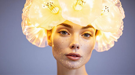 High-fashion portrait with bold lighting and makeup, black background, studio shoot quality.