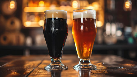 Glasses of light and dark beer on a pub background. --ar 16:9 --v 6 Job ID: 7e7c471a-bccb-4ef2-b469-5c229bd04437