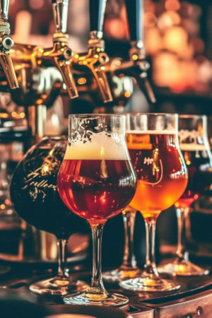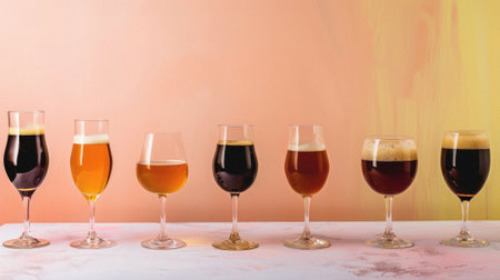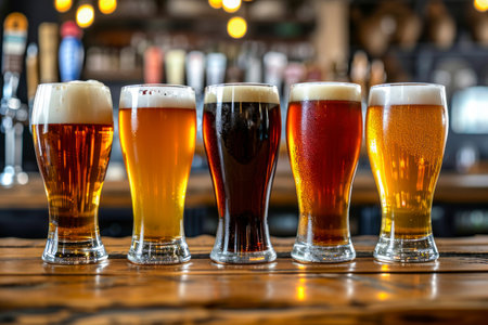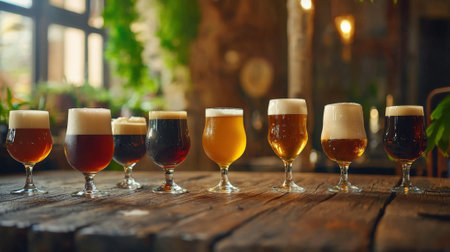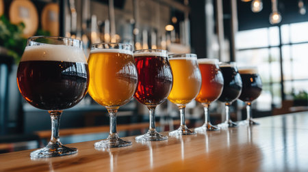 A stunning array of craft beer styles displayed in elegant glasses on a bar. Each glass showcases different colors and textures, inviting appreciation of the brewing artistry.
