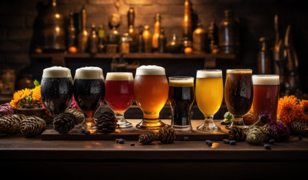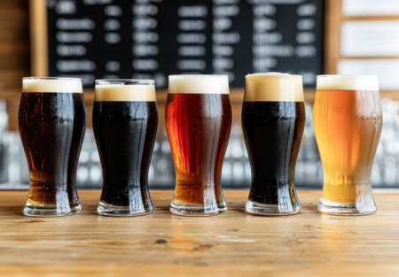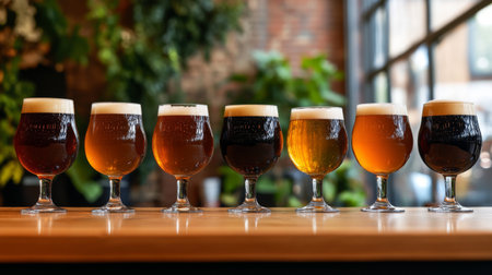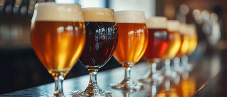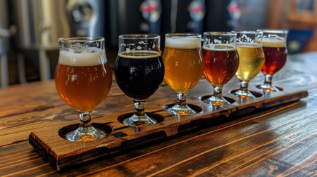 Assorted ales presented in a beer flight sampler, ready for a tasting session at a craft brewery Rich colors, inviting textures