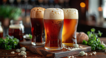 Three Glasses of Diverse Draft Beer, Refreshing and Flavorful Delights On Bar Counter