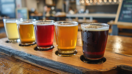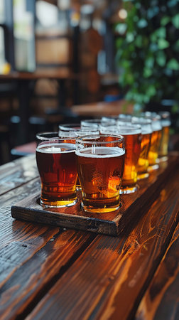 Variety of craft beers in a flight sampler, neatly arranged on a wooden board, perfect for tasting different ales at a brewery Warm, inviting colors