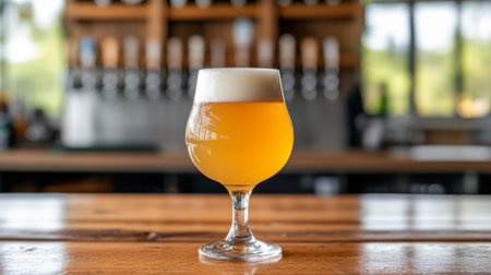 A freshly poured glass of golden beer with a foamy head sits on a wooden bar. The vibrant backdrop features a stylish bar atmosphere, perfect for socializing.