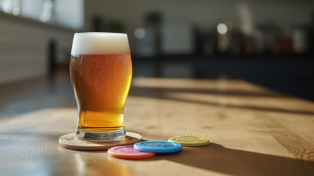 An engaging image of a beer glass with condensation, accompanied by a few colorful coasters, highlighting the casual and fun aspect of enjoying beer