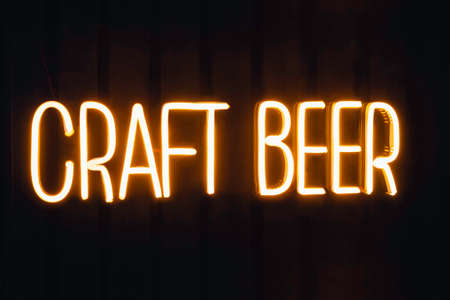 Neon craft beer sign at the window of a pub in London, UK, selective focus.