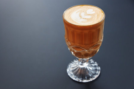 glass of coffee with foam with a pattern on a gray background
