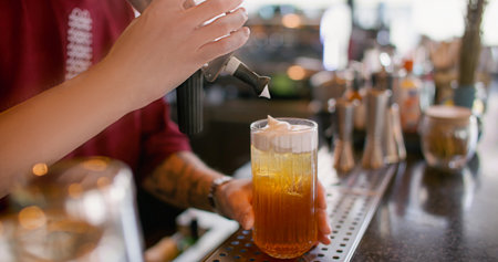 Cocktail bar. Cold cream drink. Bartender adding whipped milk top with siphon to cold ice syrup water. Preparing flavored beverage glass.