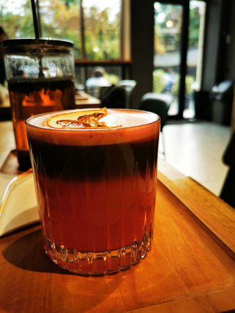 Black coffee mix with orange juice in coffee. Layered non-alcoholic cocktail recipe idea