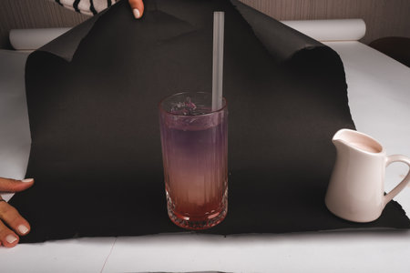 A purple set with a bright red drink