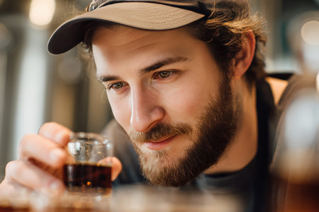 A brewer carefully tastes a small sample, displaying a thoughtful expression. The clean background and soft, flattering light enhance the quality assurance mood.