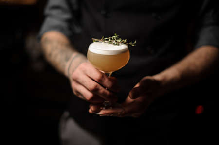 male bartender holds in his hand old-fashioned glass with cold alcoholic cocktail
