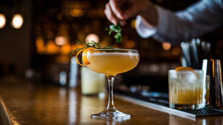 Close-up of a bartenders hands carefully placing a citrus peel garnish on a frothy cocktail in a glass on a bar counter.