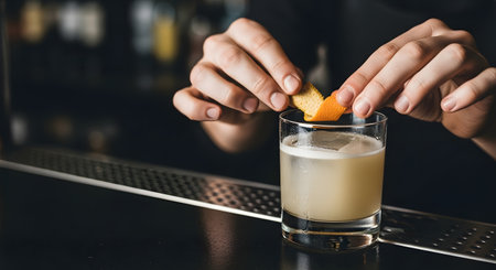 Close-up of a bartenders hands expertly garnishing a whiskey cocktail with a fresh orange peel, creating an aromatic garnish in a sophisticated bar setting.