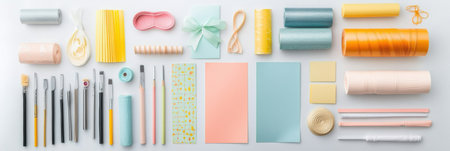 An arrangement of colorful gift wrapping materials, including papers, ribbons, and cards, tailored for creative projects and celebrations.