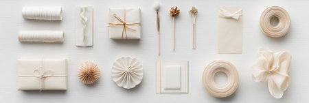 An elegant arrangement of gift wrapping items including paper, ribbons, and decorative accents, offering space for custom messages.
