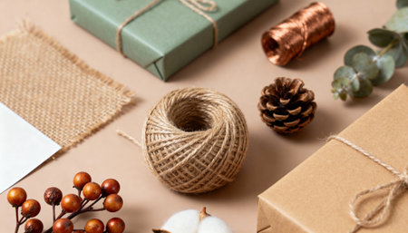 Gift wrapping supplies arranged on a neutral beige background with natural twine, kraft boxes, pinecone and seasonal botanical accents. Open beige copyspace is available for text, labels or graphic overlays