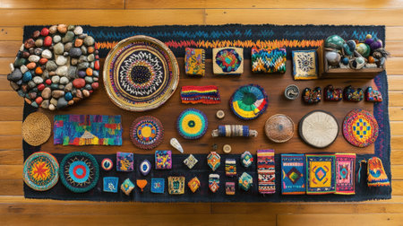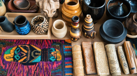 Explore a vibrant assortment of handcrafted pottery and wooden art pieces showcasing cultural heritage and craftsmanship in a captivating display.