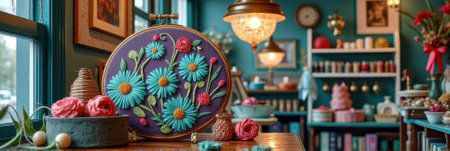 Colorful floral embroidery art in cozy craft room with vintage decor. That the image is generated using AI.