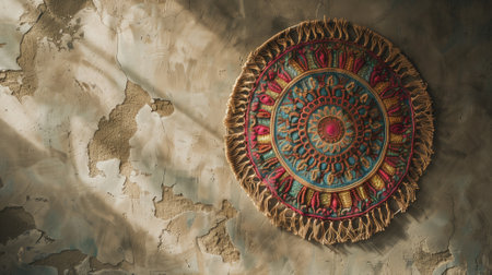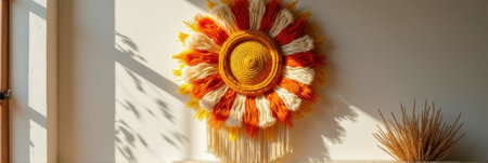 Colorful woven wall hanging with sunburst design in sunlit room. That the image is generated using AI.