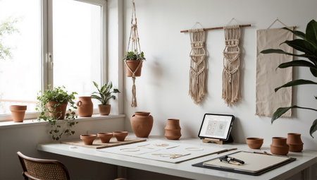 Modern Pottery Studio Workspace with Digital Tablet, Handcrafted Ceramics, Macrame Wall Hangings and Indoor Plants in Natural Light Setting