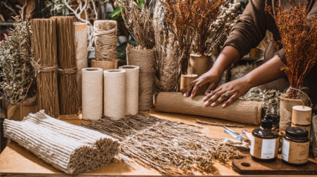 Hands arranging natural fiber backdrops and props in a studio highlighting the use of green sustainable materials in artistic set design.