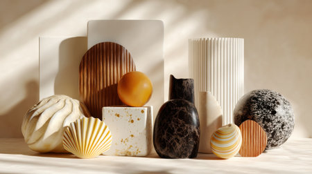 A stylish collection of modern decorative objects showcases unique forms and textures, ideal for interior design projects and artistic inspirations in a serene setting.