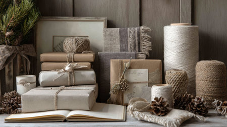 A beautifully arranged collection of rustic gift-wrapping materials, showcasing natural elements like twine, pinecones, and soft textures.