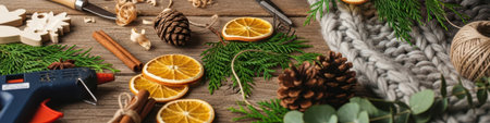 Christmas decor craft supplies, including wood blanks, cinnamon, dried orange, and foliage. Making holiday decorations.
