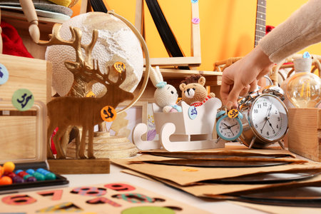 Woman holding alarm clock near table with many different stuff indoors, closeup. Garage sale