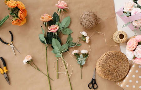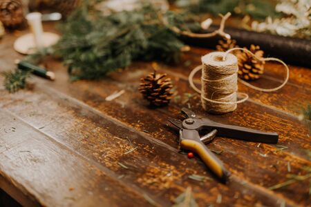 Top down view of florist's worktable. Handmade xmas decorations. Making rustic christmas wreath. Authentic rural wreath