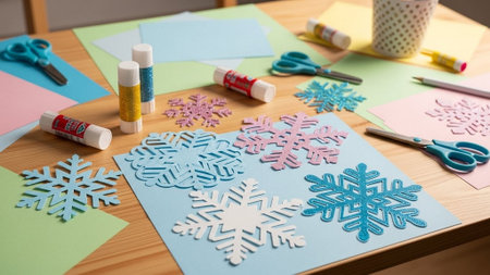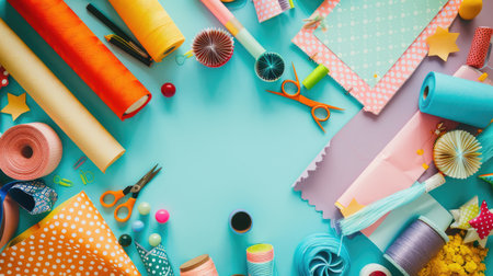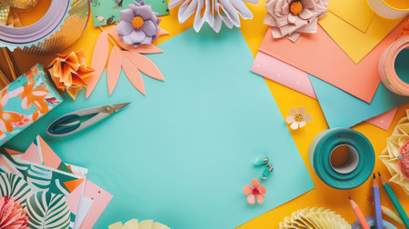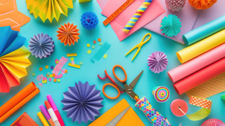 A table decorated with paper flowers, craft supplies, and colorful textiles in shades of green, azure, orange, yellow, and aqua. The vibrant electric blue patterns add an artistic touch AIG50