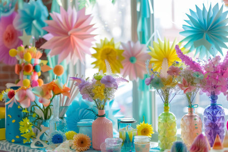A vibrant table display features handcrafted decorations, pastel-toned paper fans, and fresh flowers creating a festive ambiance