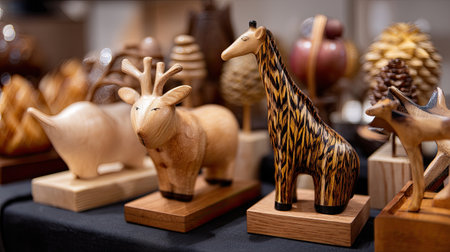 A collection of beautifully handcrafted wooden animal figurines, including a giraffe and deer, displayed in an artisan market, highlighting unique craftsmanship.