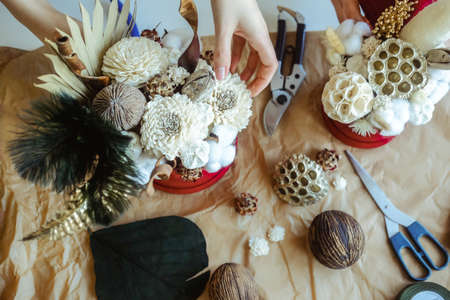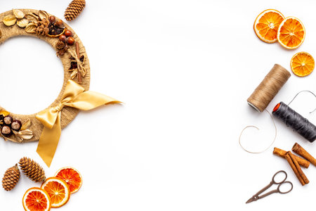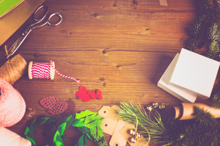 Top down view of florist's worktable. Handmade xmas decorations. Making rustic christmas wreath. Authentic rural wreath
