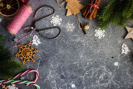 Christmas card concept with holiday decor on grey concrete background with copy space