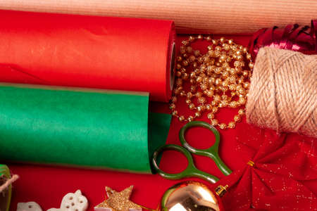 Close up shot of wrapping paper and items for christmas decorating on red background