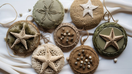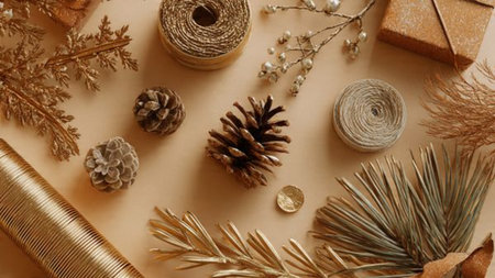 Wrapping gifts and creating eco friendly christmas cards and ornaments in neutral colors. No plastic, zero waste xmas celebration concept. Top view, flat lay